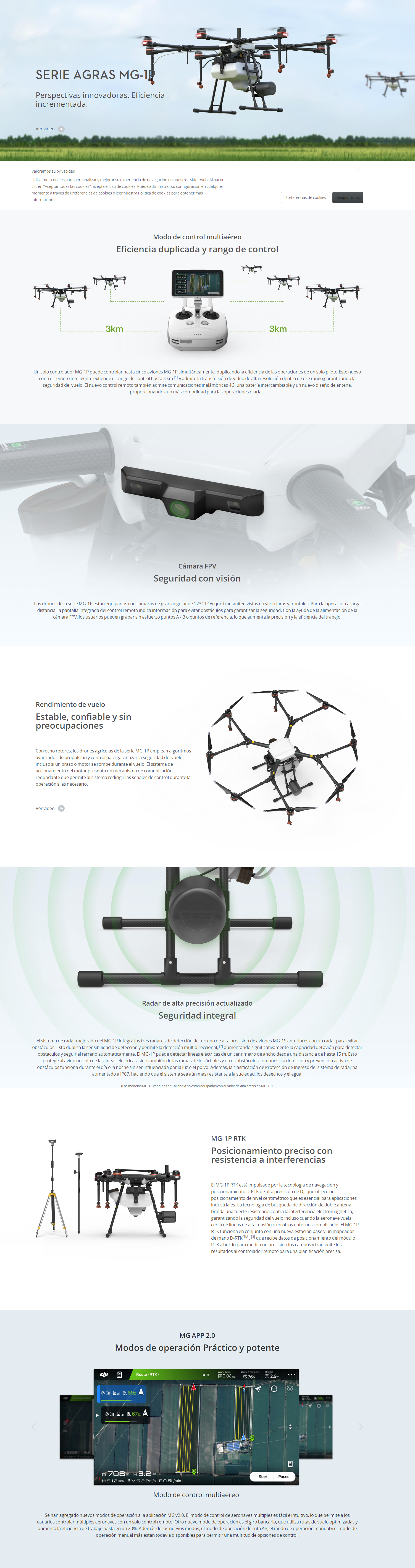 | Dimensiones: | MG-1P: 1460 × 1460 × 578 mm (brazos desplegados, sin hélices) 780 × 780 × 578 mm (brazos plegados) MG-1P RTK: 1460 × 1460 × 616 mm (brazos desplegados, sin hélices) 780 × 780 × 616 mm (brazos cruzados) |
