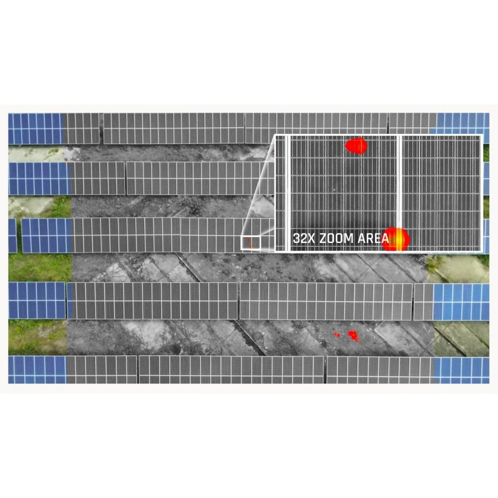 En la imagen de ejemplo a continuación, el dron está volando sobre paneles solares a una altitud de 40 m (44 yardas). Con el potente zoom de ANAFI USA, el piloto puede detectar puntos calientes centimétricos en los paneles solares.